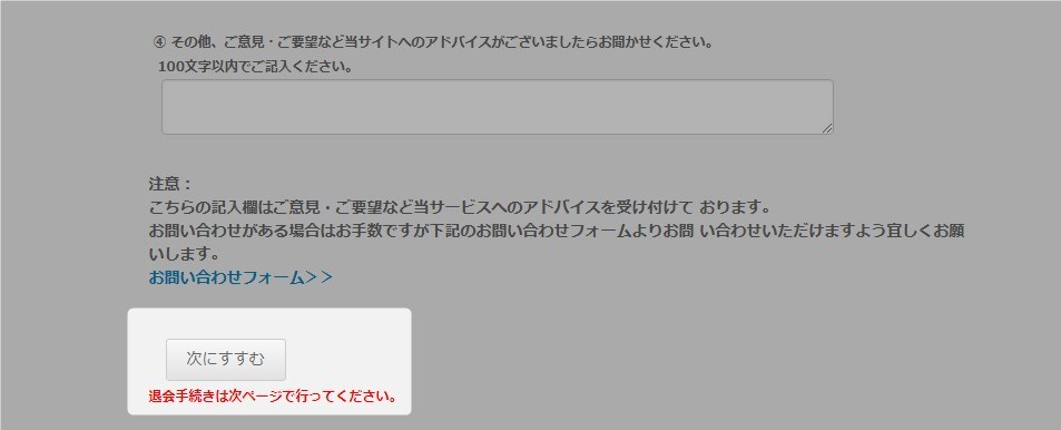 ご入会案内ぺ―ジを下にスクロールしていくと、退会はこちら>>>退会フォームへ というボタンがあるのでこちらをクリックしましょう。