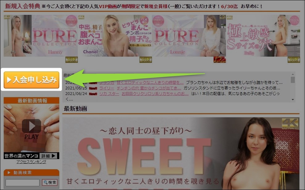金髪天国にログインした状態でサイトを開き、金髪天国の入会方法の手順1と同じく「入会申し込み」ボタンをクリックします。