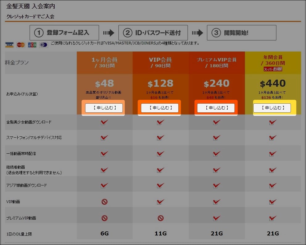 金髪天国の入会案内ページが開くので、任意のプランの「申し込む」ボタンをクリックします。